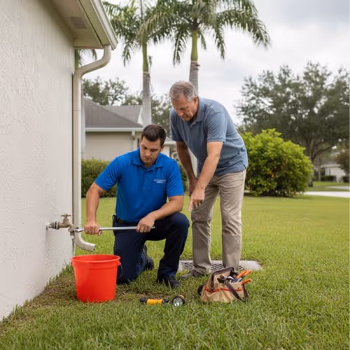 Inspect sump pumps, clear gutter downspouts, and test your main shutoff valve before June rains arrive. Check outdoor faucets for leaks, secure hose connections, and verify septic drain field drainage. Groveland's low elevation near Green Swamp makes proper drainage critical during storms.